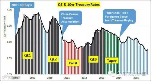 下图显示的是,当美联储量化宽松计划开始时,国债收益率在每一轮量化宽松计划中上升,在量化宽松计划停止时开始下跌。2011年,当中国和金砖国家开始停止买入美国国债,收益率下跌。当美联储和外国买家在2014年底停止买入国债时,收益率会进一步下跌么?