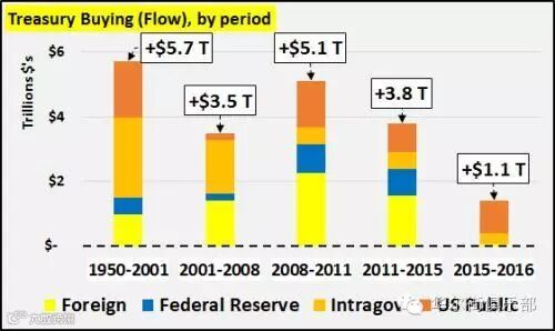 1950年至2001年,2001年至2008年,2008年至2011年,2011年至2015年以及2015年至2016年美国国债发行量以及外国买家,美联储,美国政府和美国民众购买国债占比。