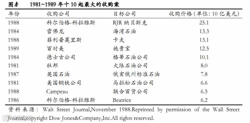在杠杆的支撑下,一些最大型的公司成了收购目标,第四次并购浪潮逐渐演变成为一场史无前例的超级并购狂潮。在当时,每个人都相信,只要风云人物米尔肯愿意,随时可以帮助一家企业将GE收入囊中。下图是1981-1989年美国最大的10起并购案,大家不妨感受下。