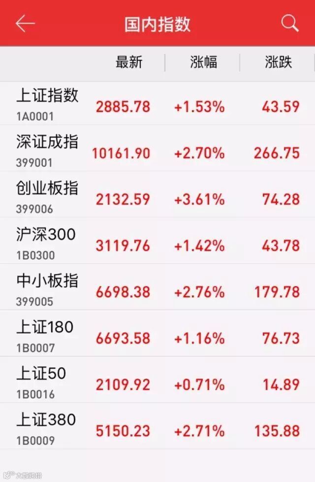 【沪指大涨1.53% 创业板涨3.61%!两市近70股涨停!】周三早盘,受MSCI宣布延迟纳入A股消息影响,沪深两市双双低开,开盘后两市低开高走迅速反弹翻红,深成指重回万点关口,创业板势不可挡最高涨逾4%。临近午盘,沪指拉升涨逾1%,剑指2900点。两市近70股涨停,364只个股涨幅达5%。截止午盘,沪指报2885.78点,涨幅1.53%,深成指报10161.9点,涨幅2.7%,创业板报2132.59点,涨幅3.61%。