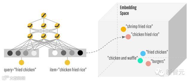 然后,许多用户说他们厌倦了 app 的推荐。他们想发现类似但不同的菜品,希望得到惊喜。于是你再次动用你的 TensorFlow 工具包,为 FoodIO 3.0 训练了一个深度前馈神经网络。通过深度模型,你为每个请求和物品找到了低维稠密表示 (通常称为嵌入矢量)。这样,FoodIO 能够通过在嵌入空间中对请求内容进行近邻匹配来推广。例如,你发现请求“炸鸡”的人不介意也来个“汉堡”。