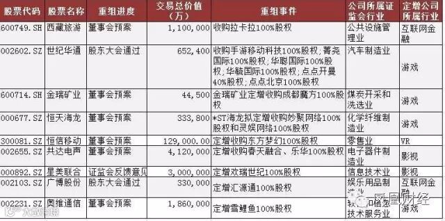 目前上市共有5家上市公司在进行金融、游戏、影视和VR四个行业的跨界定增。其中,西藏旅游、厦华电子、金瑞矿业以及恒天海龙定增进度还处于董事会预案,世纪华通定增已获股东大会通过。