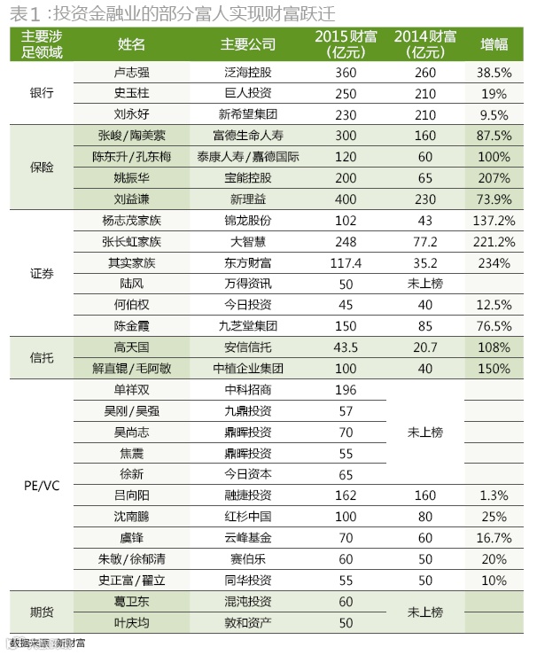 对金融业富豪来说,眼下正逢大年。保险系富人——富德生命人寿的张峻、陶美萦夫妇,泰康人寿的陈东升、孔东梅夫妇的财富,过去一年的增值率分别为87.5%和100%。旗下一参一控两家券商的锦龙股份(000712)实际控制人杨志茂家族,由于证券市场下半年的火爆,身家水涨船高,增值137.2%,达102亿元。