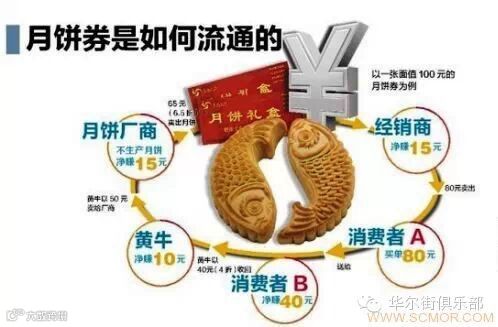 【月饼证券化】:克里斯汀等厂商印了一张100元的月饼券,以65元卖给了经销商,经销以80元一张卖给了消费者A,消费者A将月饼票送给了B,B以40元一张卖给了黄牛,厂商最后以50元一张向黄牛收购。 你看,没有生产月饼,厂商赚了15 ,经销赚了15 ,A送了人情 ,B赚了40 ,黄牛赚了10。这就是月饼的证券化。