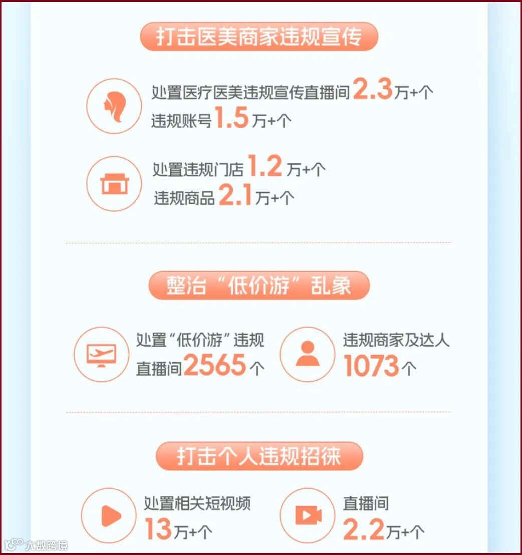 报告显示,过去一年,平台处置医疗医美违规直播间超2.3万个,违规账号超1.5万个,违规门店1.2万个,违规商品2.1万个;处置色情低俗违规商家超9万个,违规商品5万个;管控低价游违规直播间2565个,违规商家及达人1073个。