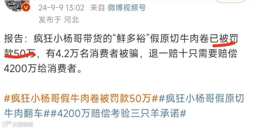 教师节前一天,职业打假人王海发布视频称,疯狂小杨哥带货的“鲜多裕”牛肉卷因虚假宣传被罚款50万,有4.2万名消费者受到欺骗,根据退一赔十原则,小杨哥需要赔偿4200万元给消费者。