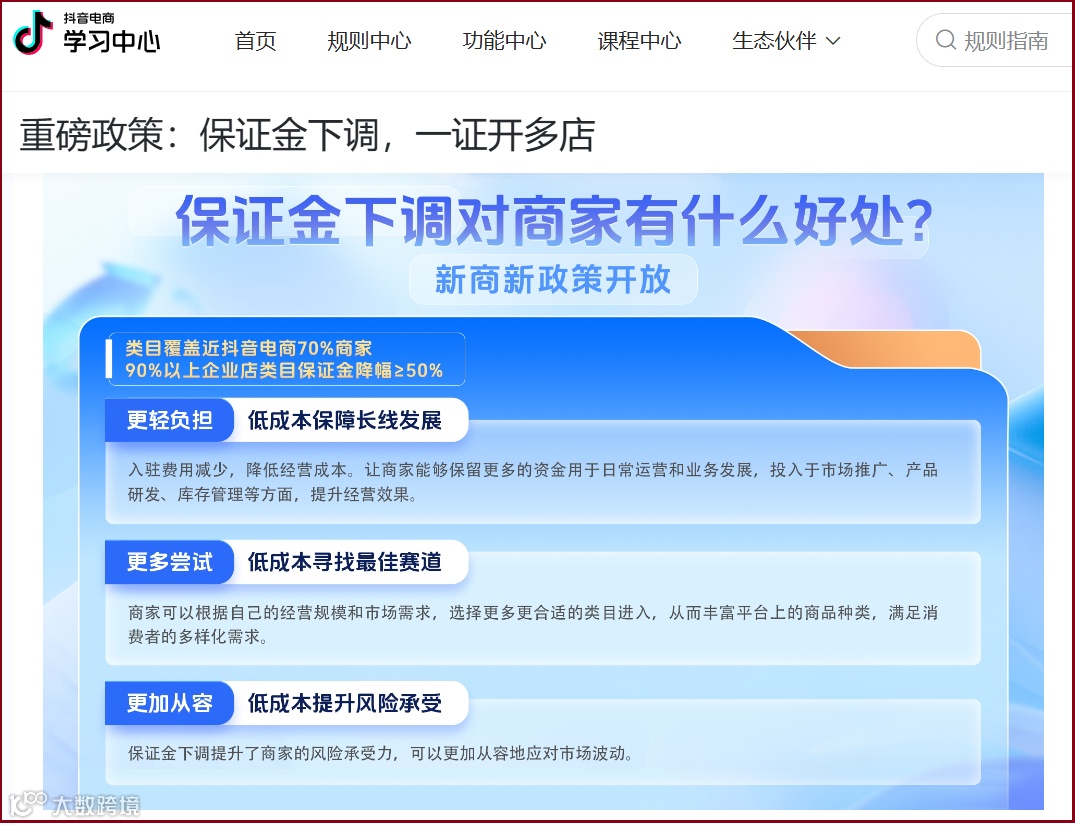 这一政策推出后,平台保证金下调幅度相当可观,将覆盖某音电商近70%商家,90%以上企业店类目保证金降幅≥50%。以个体店为例,家庭个人清洁工具,收纳整理用品,玩具,童车,积木模型这些类目保证金从2000变为1000。