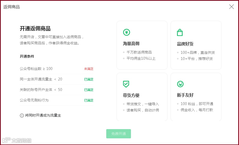 根据微信官方介绍,只要公众号粉丝数≥100就可以开通返佣商品功能,每条图片消息可以插入三个商品,每成交一单,创作者便可获得相应的佣金分成。