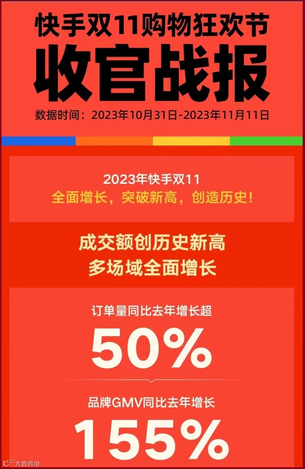 快手官方数据显示,近1亿快手消费者和超过100万的商家、达人参与了此次大促,双11全周期订单量同比去年增长超50%,动销商品数增长超50%,中小商家GMV同比增长75%,品牌GMV同比增长155%,同比增长达100%的品牌商家数量近2500家。