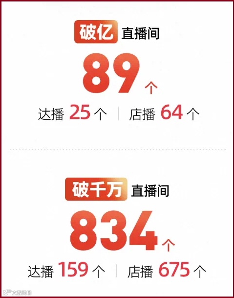 直播带货方面,达播店播双重爆发,预售期 4 小时内首次出现成交破亿的品牌直播间;全周期出现了89个破亿直播间,其中达播25个,店播64个;834个破千万直播间,其中达播159个,店播675个。