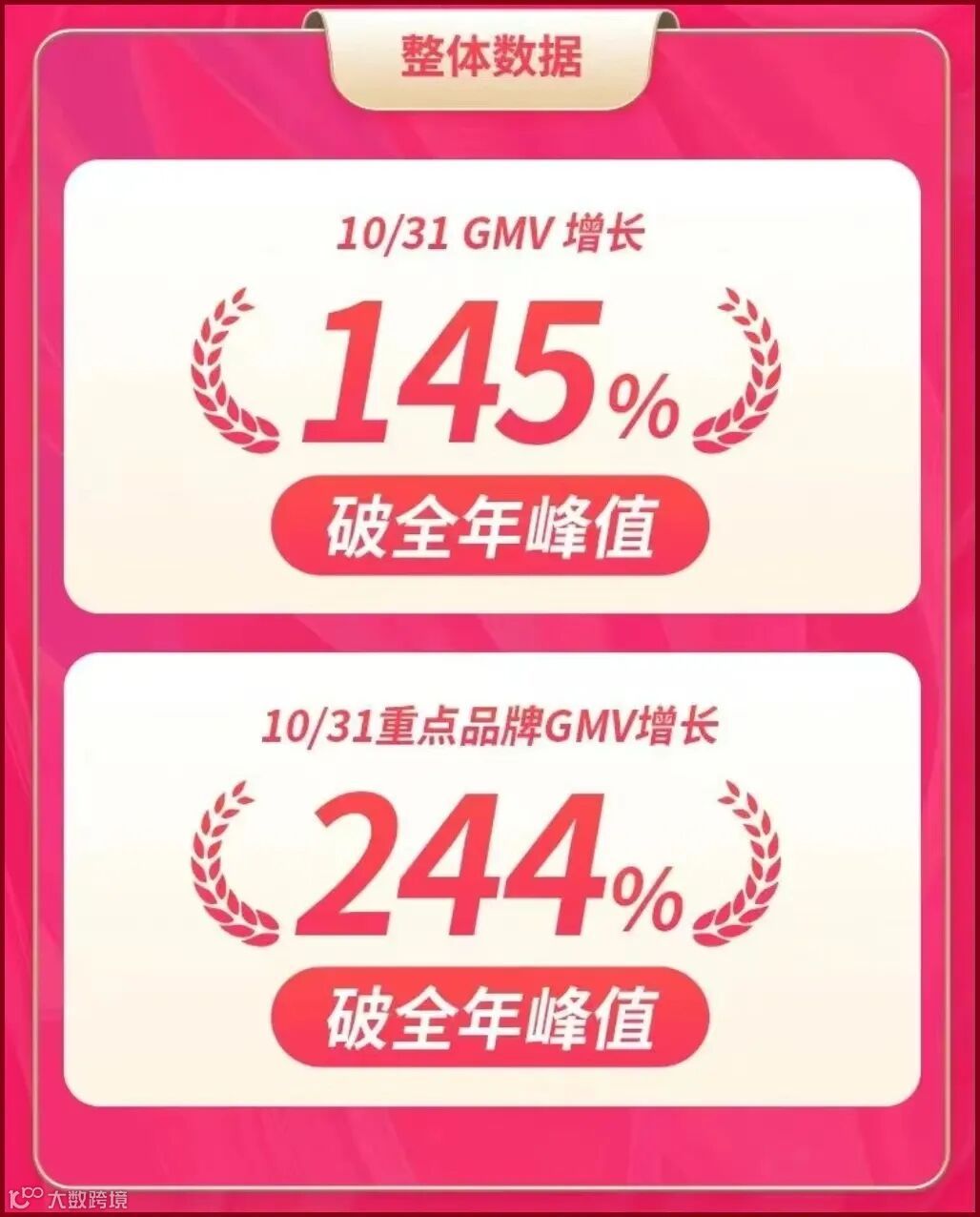 官方数据显示,10月31日当天,某音电商多项数据突破全年峰值,品牌商家整体GMV增长145%,重点品牌GMV增长244%。其中,货架场品牌商家整体GMV增长203%,商城金卡底池品牌商品增长403%实现大爆发,搜索GMV增长88%。10月20日至10月31日,超值购重点货品池增长209%。