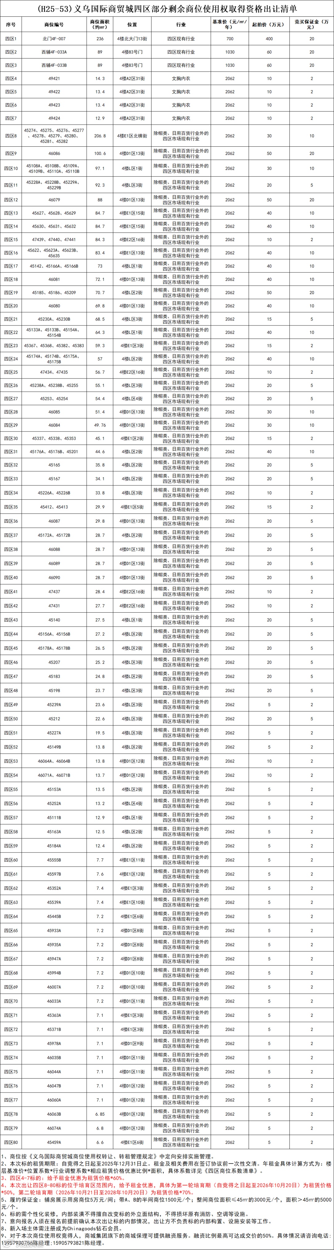 受委托,向社会公开出让国际商贸城四区商位的使用权取得资格,共计80个标的;行业为四区市场现有行业、文胸内衣、除帽类和日用百货行业外的四区市场现有行业。具体的商位号、行业、商位面积、起始价、竞买保证金等情况详见《出让清单》。其中面积数据仅作参考,以实地现状为准。 |