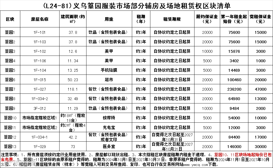 现向社会公开招租义乌篁园服装市场部分辅房及场地,共计13个区块,分别位于篁园市场一楼、三楼、六楼。辅房及场地详见以下招租清单。