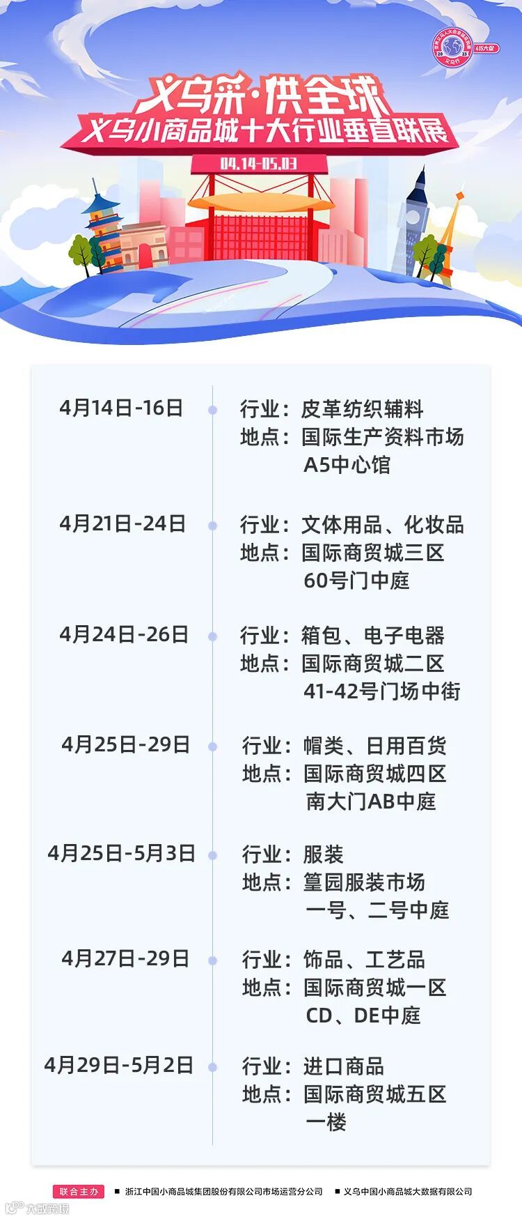 “创业货源地 繁荣五大洲”——2023年世界义乌人大会全球采购商“义乌行”专场活动之一,义乌市场四月联展即将开启!本次联展也是义乌小商品城415大促重要活动板块,以“义乌采·供全球”为主题,旨在向全球采购商展示来自创业货源地——义乌的品牌魅力。