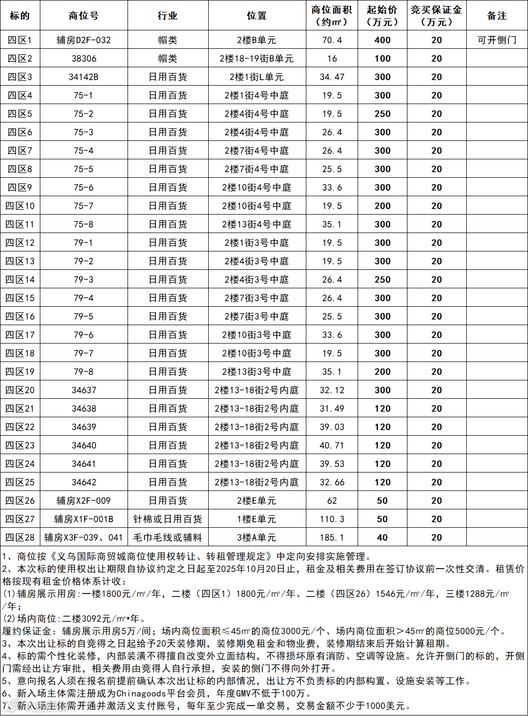 受委托,向社会公开出让国际商贸城四区商位的使用权取得资格,共计28个标的;行业分别为帽类、日用百货、针棉、毛巾毛线、辅料。具体的商位号、商位面积、起始价、竞买保证金等情况详见《出让清单》。其中面积数据仅作参考,以实地现状为准。 |