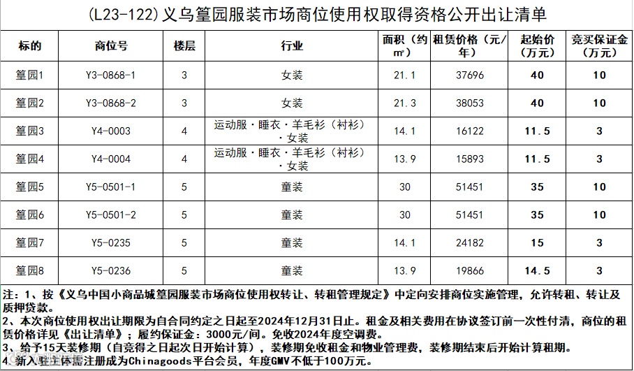 1、按《义乌中国小商品城篁园服装市场商位使用权转让、转租管理规定》中定向安排商位实施管理,允许转租、转让及质押贷款。 2、本次商位使用权出让期限为自合同约定之日起至2024年12月31日止。租金及相关费用在协议签订前一次性付清,商位的租赁价格详见《出让清单》;履约保证金:3000元/间。免收2024年度空调费。 3、给予15天装修期(自竞得之日起次日开始计算),装修期免收租金和物业管理费,装修期结束后开始计算租期。 4.新入驻主体需注册成为Chinagoods平台会员,年度GMV不低于100万元。 5、遇市场布局调整,商位使用权人应无条件服从,商位有期有偿使用协议自动终止,商位使用权人的商位使用费和其它费用(如履约保证金、物业管理费(4.02元/㎡/月)等,但不含取得资格的费用,按实际使用时间(量)计算。 6、本轮使用期满后,由浙江中国小商品城集团股份有限公司无条件收回商位使用权,下一轮商位的使用权人、使用期限和使用费视市场实际情况由浙江中国小商品城集团股份有限公司重新确定。 |