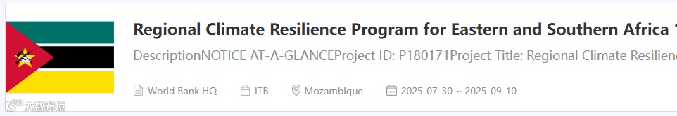 世界银行(The World Bank) 支持东部和南部非洲区域气候韧性计划一期项目 为水文气象设备的供应、安装及培训 发布招标
