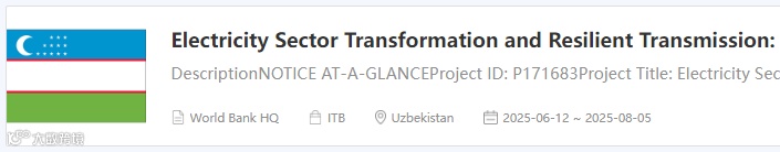世界银行(The World Bank) 支持乌兹别克斯坦电力部门转型与弹性输电项目 为两地区光纤电缆的设计、采购和安装 发布招标