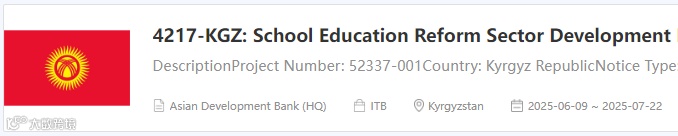 亚洲开发银行(ADB) 支持吉尔吉斯斯坦学校教育改革部门发展项目 为220所卫星学校采购实验室设备 发布招标