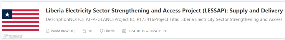 世界银行(The World Bank) 支持利比里亚电力部门加强和接入项目 为供应和交付中低压材料、配电变压器和计量材料 发布招标