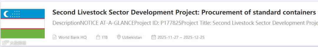 世界银行(The World Bank) 支持乌兹别克斯坦第二畜牧业发展项目采购500套配备全套设施的集装箱式兽医服务办公室 发布招标!