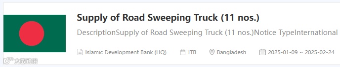 2. 孟加拉达卡Segunbagicha公共卫生工程部(DPHE)仓库部门执行工程师现邀请符合条件的投标人就本项目“道路清扫车(11辆)的供应"进行密封投标。