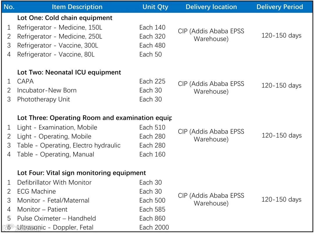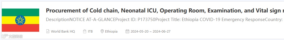 世界银行(The World Bank) 支持埃塞俄比亚COVID-19应急响应项目 采购冷链设备/新生儿重症监护室设备/手术室设备/检查设备/生命体征监测设备