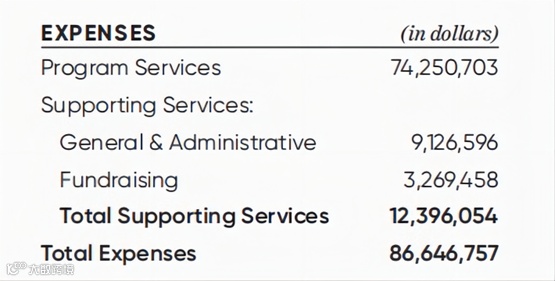 计划项目支出为74250703美元,占比约为85.7%;一般和行政支出为9126596美元,占比约为10.5%;筹款行动支出为3269458美元,占比约为3.8%。
