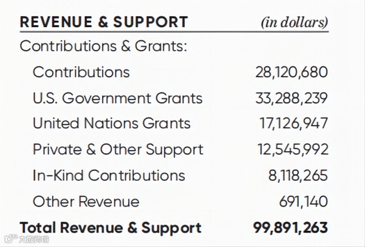 捐款收入为28120680美元,占比约为28.2%;美国政府拨款收入为33288239美元,占比约为33.3%;联合国捐款收入为17126947美元,占比约为17.1%;私人及其他捐款收入为12545992美元,占比约为12.6%;实物捐款为8118265美元,占比约为8.2%;其他收入为691140美元,占比约为0.6%。
