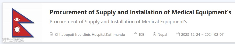 加德满都Chhatrapati免费诊所(医院)根据国际竞争性招标邀请合格投标人对医疗设备供应和安装的采购进行电子投标。