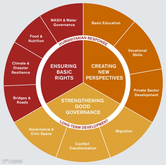 如下图所示,Helvetas通过执行长期发展和人道主义援助项目,以此来保障基本权利、创造新视角、加强善治。其项目领域涉及:WASH和水治理、食品与营养、气候与抗灾能力、路桥、基础教育、职业技能、私营部门发展、移民、冲突转化、治理与公民空间。