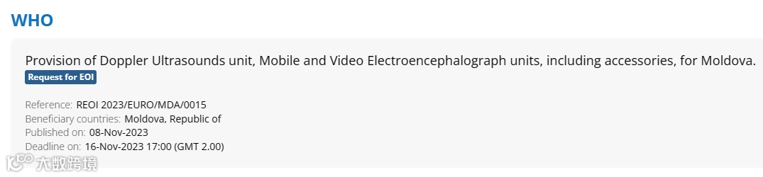 世界卫生组织(WHO) 为"向摩尔多瓦提供多普勒超声设备、移动和视频脑电图设备"招标 征求意向表达