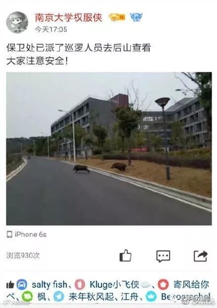 13日,南京大学 仙林校区惊现几头野猪。保卫处工作人员前往现场,但天色已晚未找到野猪,“可能是从山上下来的吧”。有同学称,4点半左右,自己在天文台附近看到两只野猪跑下来,很快又跑回了山上… 网友:或将被评为全国最佳生态校园
