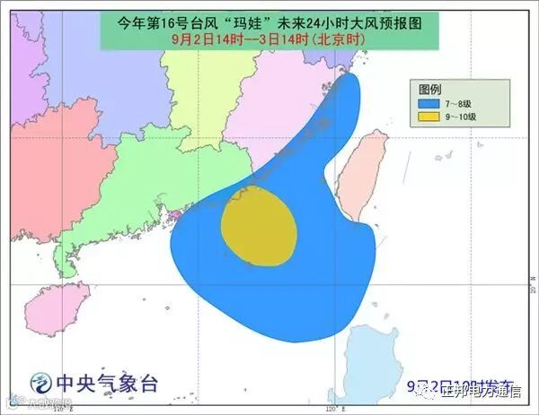 大风预报:2日14时到3日14时,台湾海峡、巴士海峡、南海东北部以及福建沿海、广东中东部沿海将有7-8级大风,“玛娃”中心经过的附近海域的风力有9-11级,阵风可达11-12级。