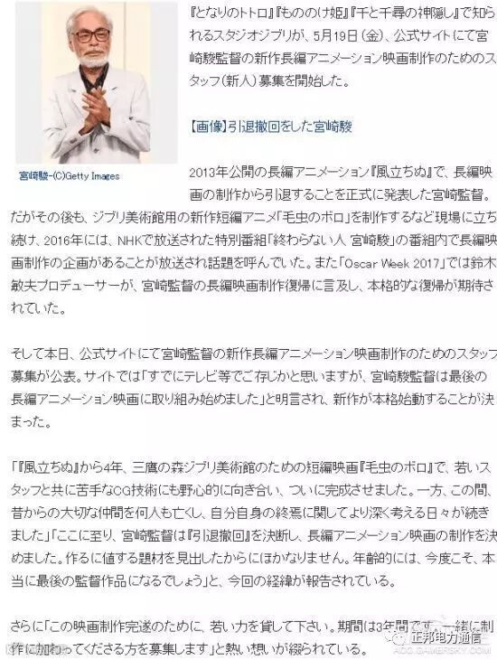 之前我们报道过日本动画大师宫崎骏虽然已经宣布退休,但是还是想要再制作一部长篇动画,大家都是感觉宫崎骏最后还要复出的。昨天(5月19日)日本媒体正式宣布宫崎骏确定复出,而且宫崎骏本人表示:这次的复出真的是他最后一次复出了。同时吉卜力也开始为宫崎骏最后的长篇动画开始招募制作人员。