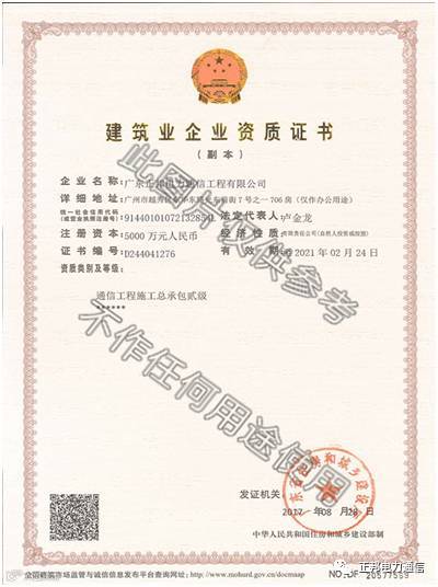 这次《通信工程施工总承包贰级》资质证书的取得,是广东省住房和城乡建设厅对公司技术水平、人员资质、服务质量、技术装备等各项综合实力的认可,完善和提高了公司在通信工程项目领域的设计、施工和技术的服务能力;进一步增强了公司综合实力和市场竞争力,为企业改革创新升级注入新的生命与活力,公司发展迎来又一次新的历史机遇。