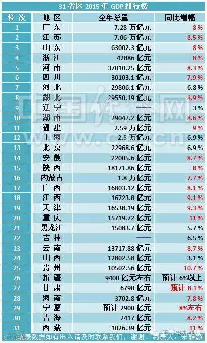 31省区2015年GDP排行榜,标红的为同比增幅超7%的地区。中国经济网 制表人:宋雅静