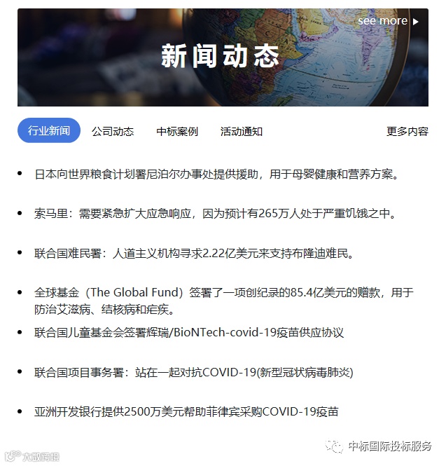 中标国际投标服务 聚焦于国际公共采购领域,致力于向行业提供数据、合规、培训、投标等赋能服务的智库型咨询服务机构。 国际公共采购大数据平台 www.ippdp.com 日更百余条国际采购招标信息,助您了解国际公采市场需求,拓展出海新思路。