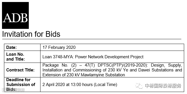 1.缅甸联邦共和国已收到亚洲开发银行(ADB)的贷款,用于支付电网开发项目的费用,并计划将一部分款项用于“230千伏YE、Dawei变电站的设计、供应、安装、调试和230千伏Mawlamyine变电站的扩建”项目下的付款。该标对亚行所有合格投标人开放。