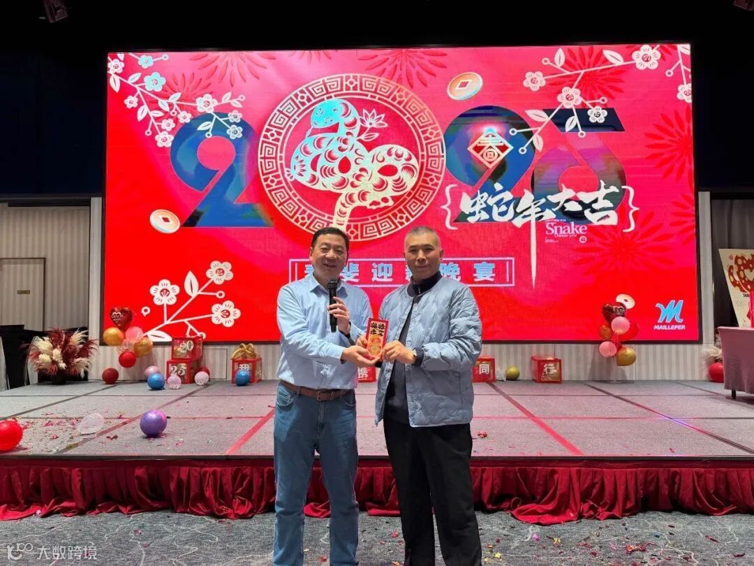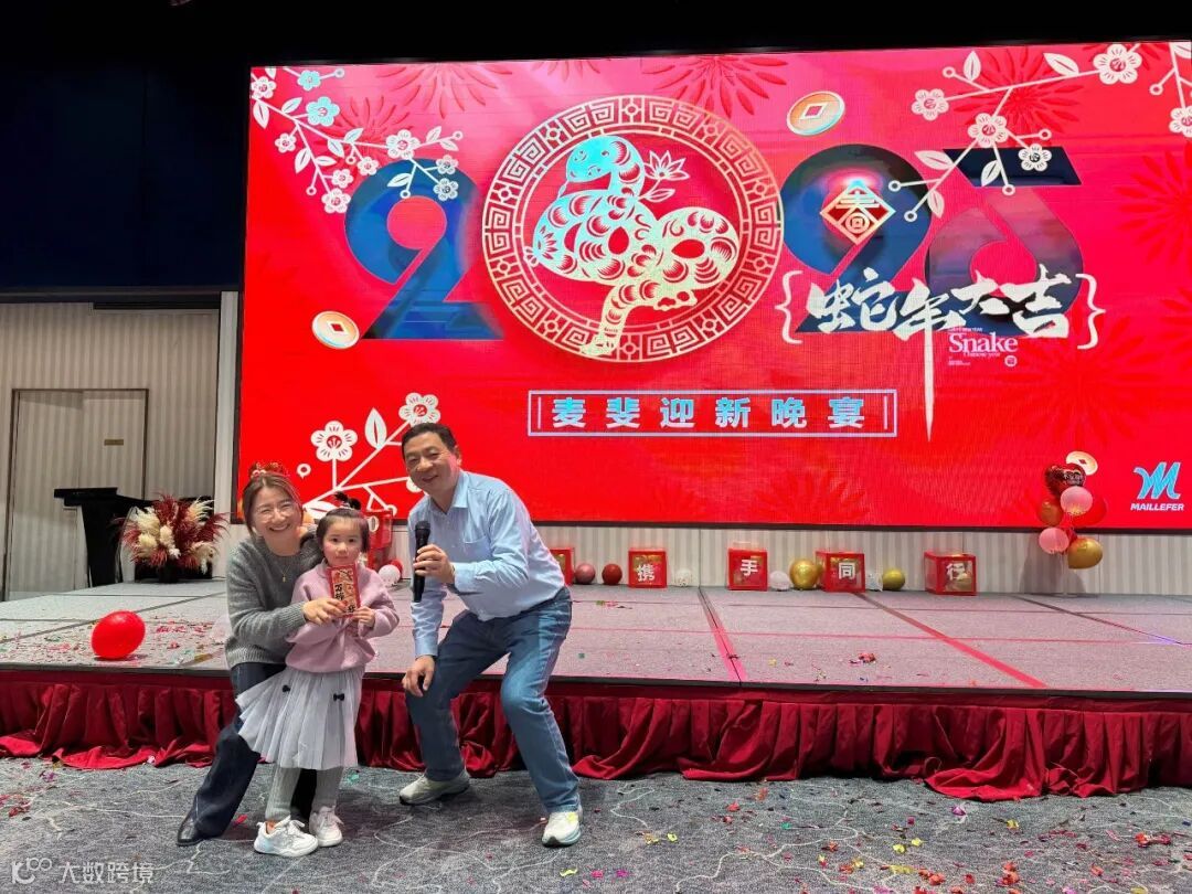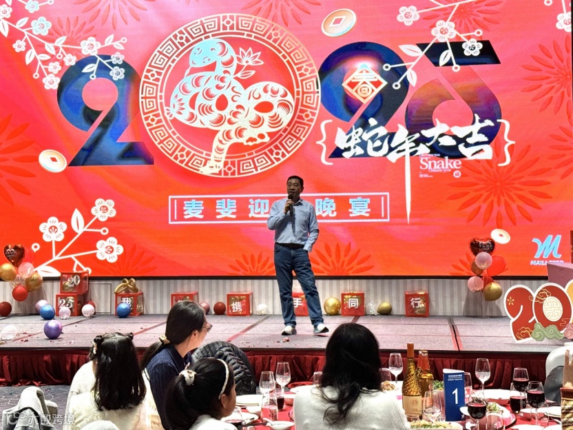 麦斐公司领航人吴云杰总经理上台发表了新年致辞。吴总首先对所有员工在过去一年中的努力和贡献表示了衷心的感谢,特别是对服务团队的高频出差率和办公室团队的默默支持给予了高度评价,同时特别感谢所有员工家属的大力支持。他不仅回顾了公司的成就,也对新一年的工作提出了期望和祝福,激励着每一位员工在新的一年里继续努力,共创佳绩。