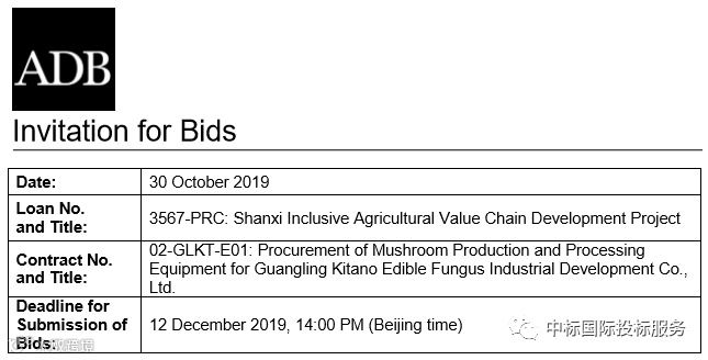 1. 中华人民共和国已收到亚洲开发银行(ADB)的贷款,用于支付山西农业全纳价值链发展项目的费用,并计划将一部分款项用于采购蘑菇生产加工设备合同项下的付款。该标对亚行所有合格投标人开放。