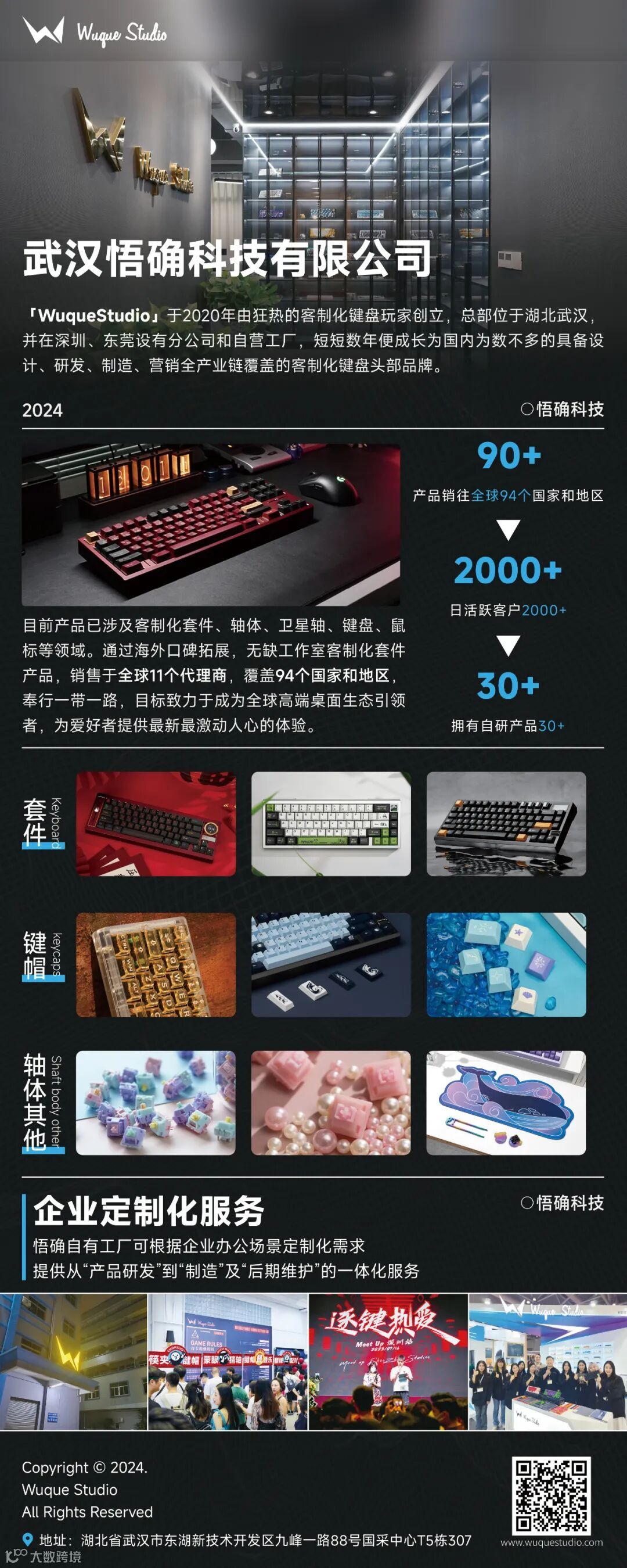 武汉悟确科技有限公司集研发、生产、销售于一体,为了拓展全球市场,自主成立了多个高端电竞外设品牌,公司积极拓展海外独立站、国内各大电商网站及线下销售渠道实现B2B\B2C的产品销售业务,同时也有在承接企业及友商品牌的外设周边定制及代工服务项目。为满足广大客制化用户需求,公司不断推陈出新,在产品生产工艺、外观等方面拿下了多项专利。通过“代工+品牌”双轨并行和数字化营销的创新模式,加上政策的扶持,外贸业务实现了可观的增长。