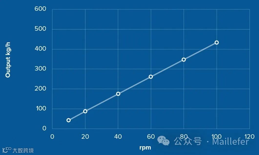 在整个螺杆工作范围内,螺杆转速和每个转速kg/hr之间存在明显的线性关系(见下图)。我们将其与在现场运行的光滑机筒挤出机的对应数据进行了比较。使用螺旋槽进料结构的线性度提升了大约三倍。在挤出机的整个工作范围内,螺旋槽式进料非线性最小,小于2%。该项测试是在一台80mm挤出机上进行的,通过机头和模具进行PVC加工。”