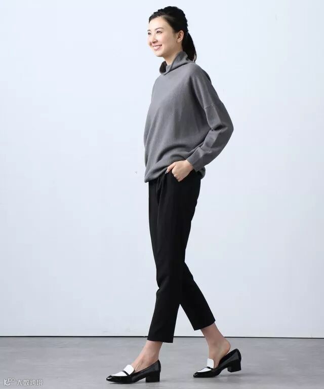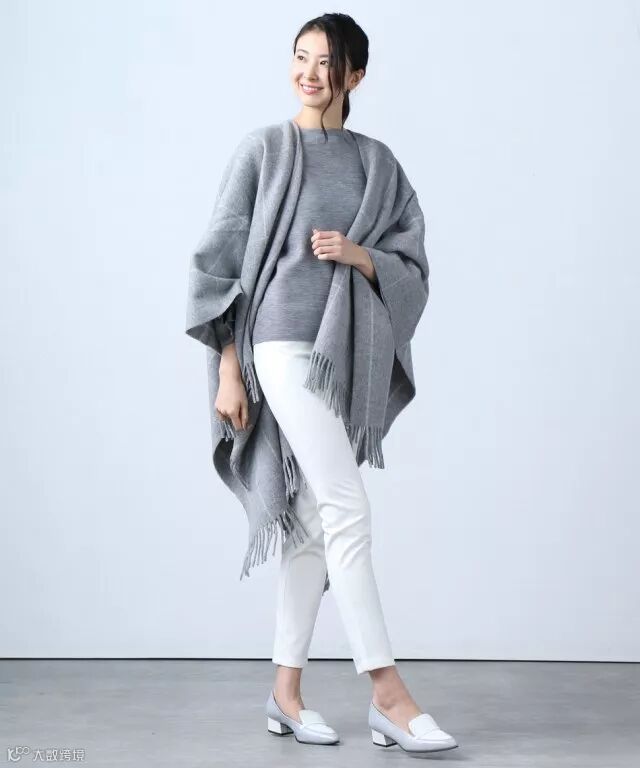 针织衫+披肩+美腿裤+坡跟皮鞋