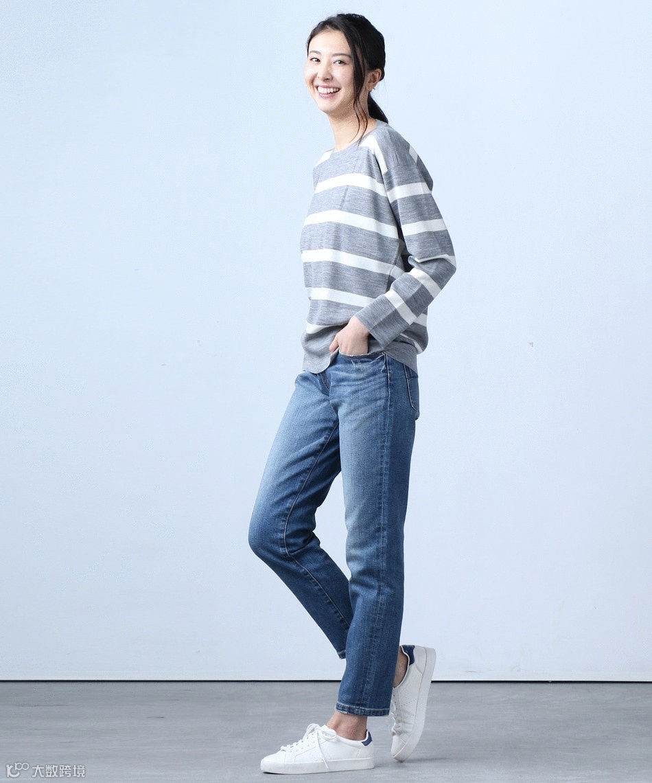 条纹针织衫+风衣+牛仔裤+跑鞋