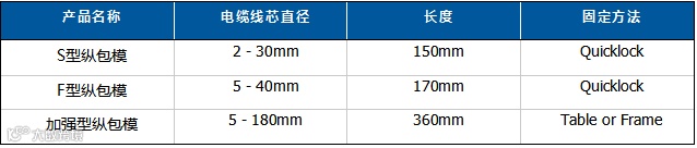 客户可选用的电缆线芯模具直径为5-180mm。它也为钢制,有框架或工作台两种固定方式。有两种生产线方向可选。