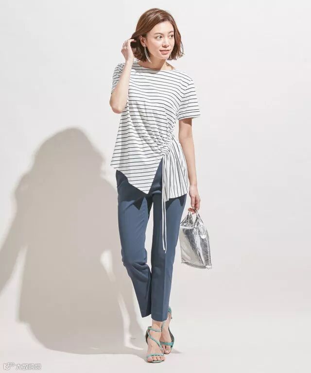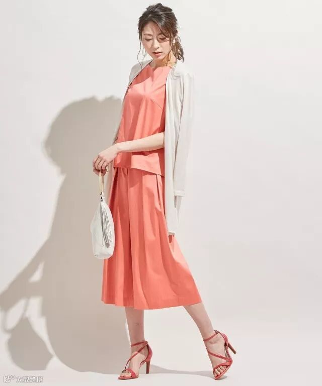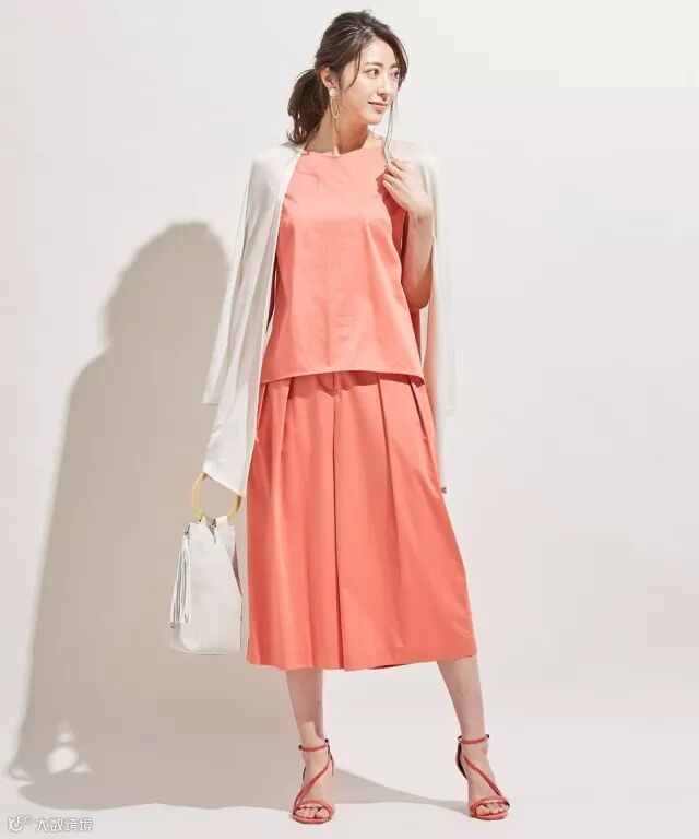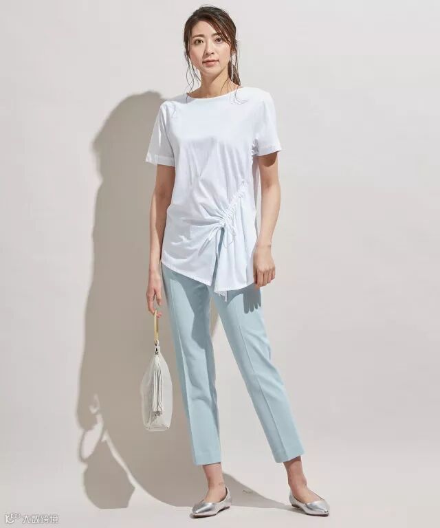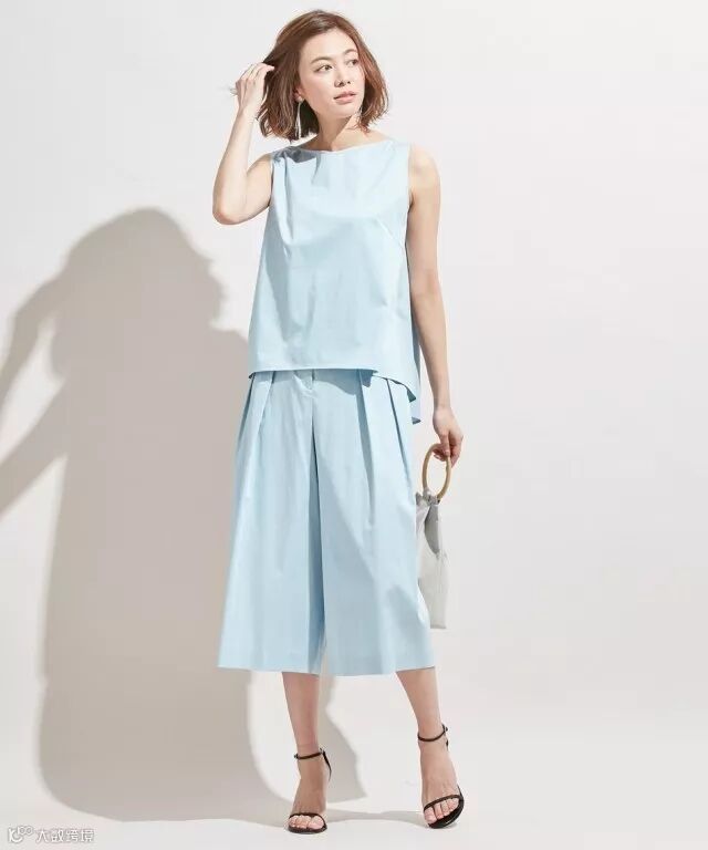 一款阔腿9分裤,通过2道折裥,使得裤子更为宽松更有律动感,在简单的设计中,有季节感的色彩成为亮点。
