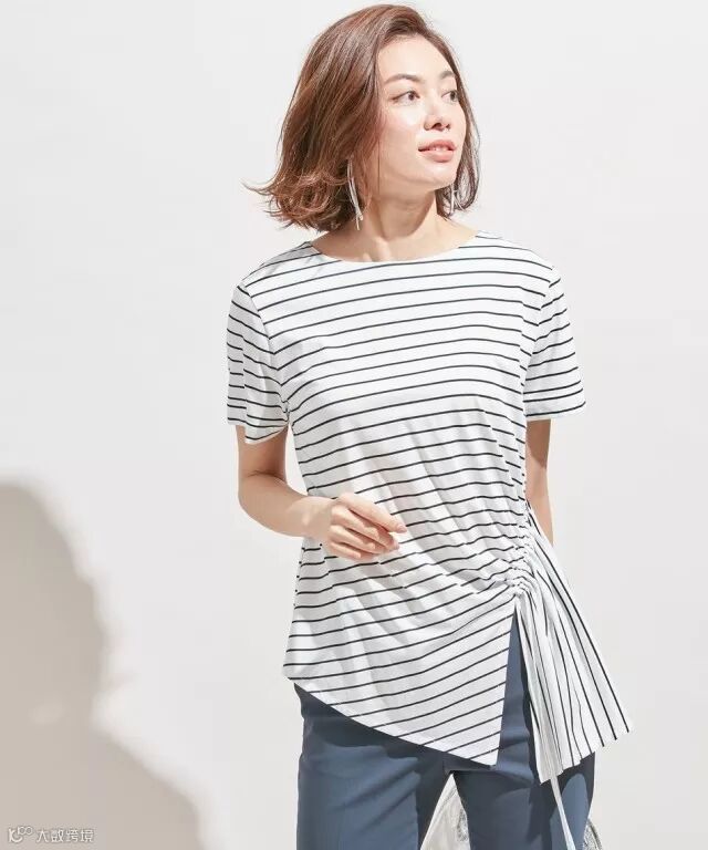 前身有抽带装饰的一字领套头衫,袖子的长度可以很好的遮盖赘肉,内搭或是单穿都很出彩。
