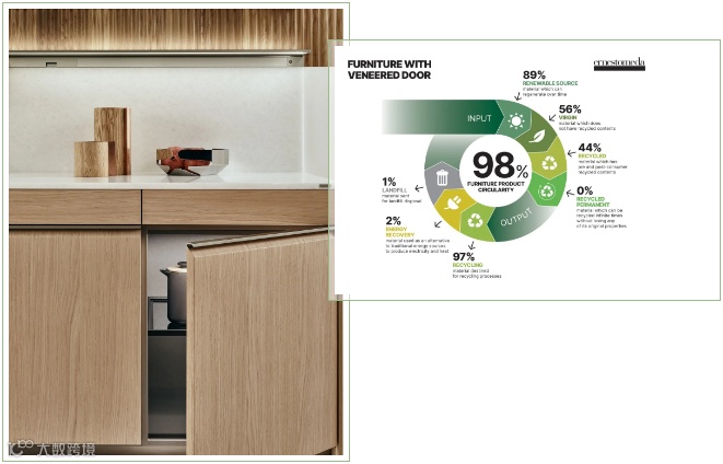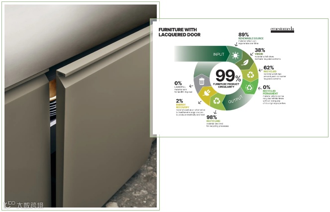 Ernestomeda是意大利首批获得产品循环认证的装配式厨房制造商之一,该项认证由组织机构Cosmob根据UNI EN ISO 14021标准进行审计、考核,它们在进行该项认证之前,还公布了自身的操作规程“Cosmob Qualitas Praemium-Evaluation of product Circularity”。