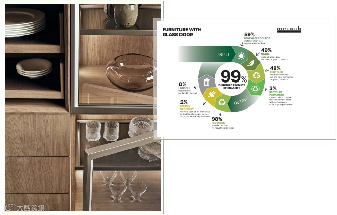 产品循环度是通过测量用于生产生态可持续产品的资源(物质平衡)来评估的。在Ernestomeda的认证中,这涉及到对所有家具产品的测试,包括各种分散结构和已完成的产品样式,特别是带有贴面、层压、喷漆和玻璃门的部分,以及不同组件的测试。基于一系列的指标,概述出输入材料的类型和输出材料的去向,确保材料的安全可靠。